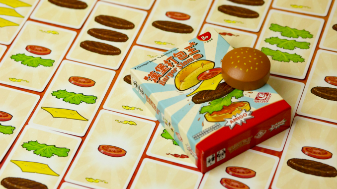 漢堡有四種配料:「番茄」、「生菜」、「牛肉」、「起司」,大家輪流翻牌隨機丟進去。